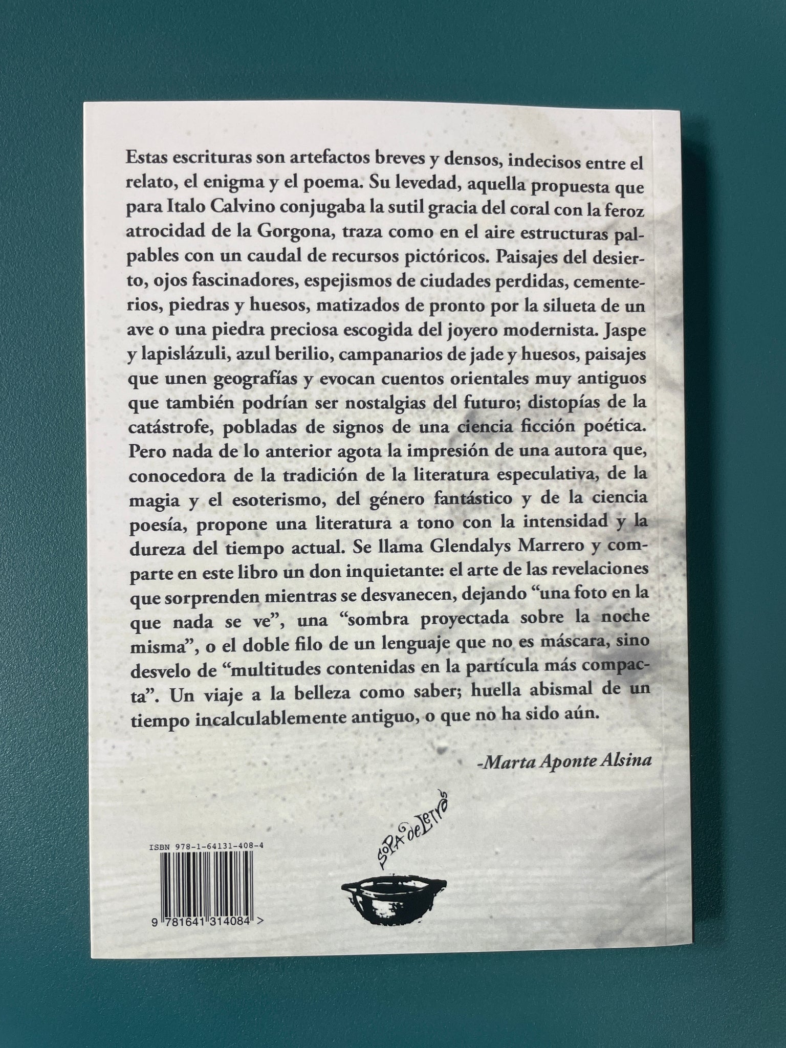 "Estas escrituras son artefactos breves y densos, indecisos entre el relato, el enigma y el poema. Su levedad, aquella propuesta que para Italo Calvino conjugaba la sutil gracia del coral con la feroz atrocidad de la Gorgona, traza como en el aire estructuras palbables con un caudal de recursos pictóricos. Paisajes del desierto, ojos fascinadores, espejismos de ciudades perdidas, cementerios, piedras y huesos, matizados de pronto por la silueta de un ave o una piedras preciosa escogida del joyero modernista. Jaspe y lapislázuli, azul berilio, campanarios de jade y huesos, paisajes que unen geografías y evocan cuentos orientales muy antiguos que también podrían ser nostalgias del futuro; distopías de la catástrofe, pobladas de signos de una ciencia ficción poética. Pero nada de lo anterior agota la impresión de una autora que conocedora de la tradición de la literatura especulativa, de la magia y el esoterismo, del género fantástico y de la ciencia poesía, propone una literartura a tono con la intensidad y la dureza del tiempo actual. Se llama Glendalys Marrero y comparte en este libro un don inquietante: el arte de las revelaciones que sorprenden mientras se desvanecen, dejando "una foto en la que nada se ve", una "sombra proyectada sobre la noche misma", o el doble filo de un lenguaje que no es máscara, sino desvelo de "multitudes contenidas en la partícula más compacta". Un viaje a la belleza como saber; huella abismal de un tiempo incalculablemente antiguo, o que no ha sido aún."