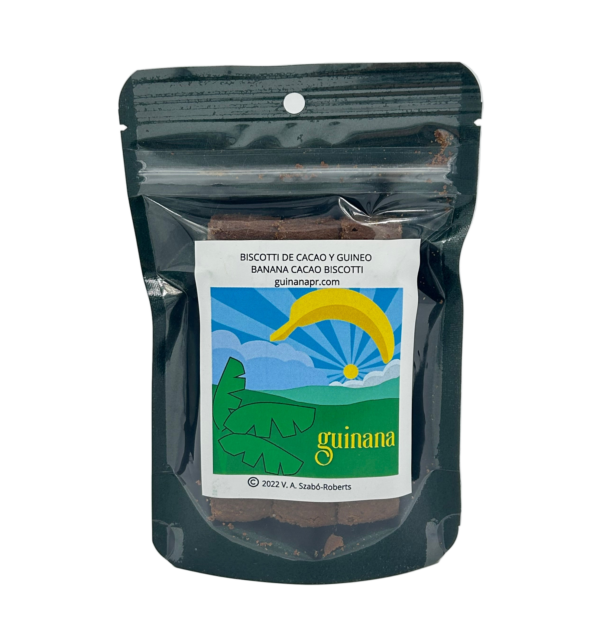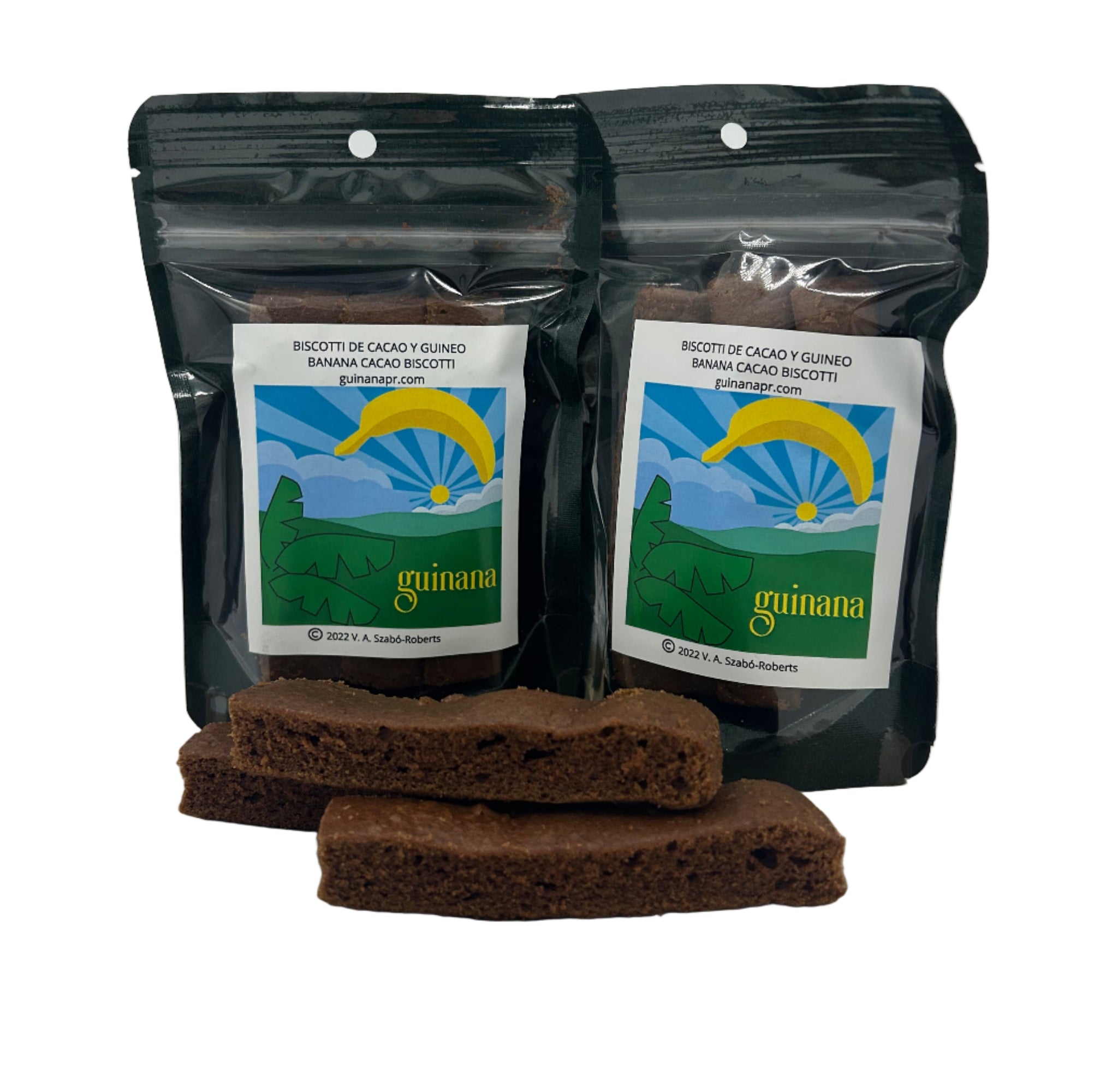 "Nuestros guineos crecen orgánicamente con mucho cariño, desde el árbol hasta tu mesa. Los trasladamos directamente de nuestra finca en Adjuntas a nuestro hogar, donde maduran naturalmente sin ningún químico ni pesticida. Aquí los mezclamos, horneamos y empacamos, manteniendo todo libre de rellenos y aditivos para que disfrutes un biscotti auténtico y natural.