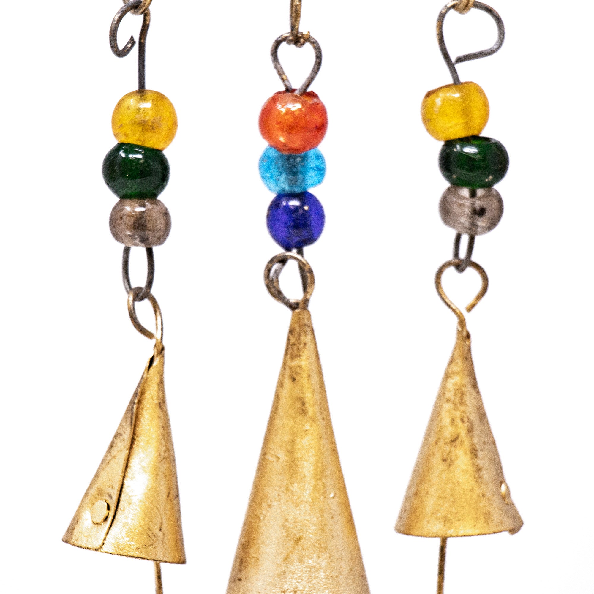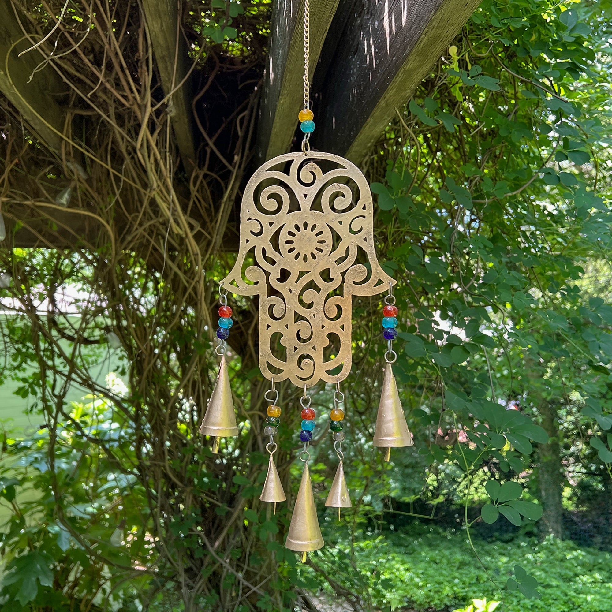 El carillón de la Mano de Fátima está hecho con hierro reciclado cortado a mano para formar los detalles. Las cuentas de vidrio crean acentos coloridos y la pieza está rematada con 5 campanillas. Este carillón funciona bien como arte de interior o como wind chime de jardín al aire libre.